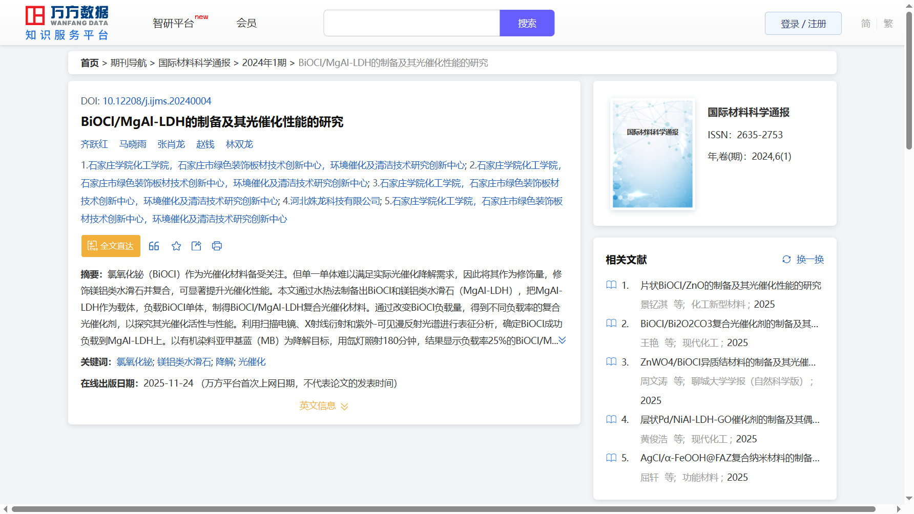 齐跃红, 马晓雨, 张肖龙, 赵钱, 林双龙, BiOCl/MgAl-LDH的制备及其光催化性能的研究[J]. 国际材料科学通报, 2024; 6: (1) : 18-24.