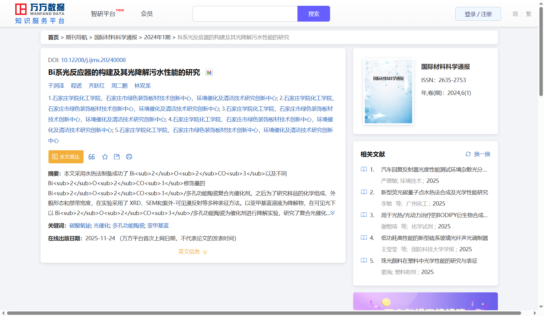 于润泽, 程诺, 齐跃红, 周二鹏, 林双龙, Bi系光反应器的构建及其光降解污水性能的研究[J]. 国际材料科学通报, 2024; 6: (1) : 49-57.